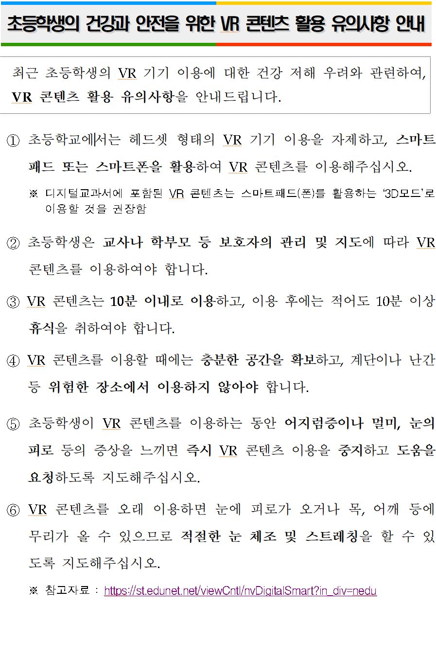 그러하기에 학생의 환경에 맞도록 해당 콘텐츠를 사용하라고 권장하고 해당 콘텐츠 개발사에 5분, 10분간 착용 시 안내문구를 주도록 하는 것이 맞지 않을까 싶다.
