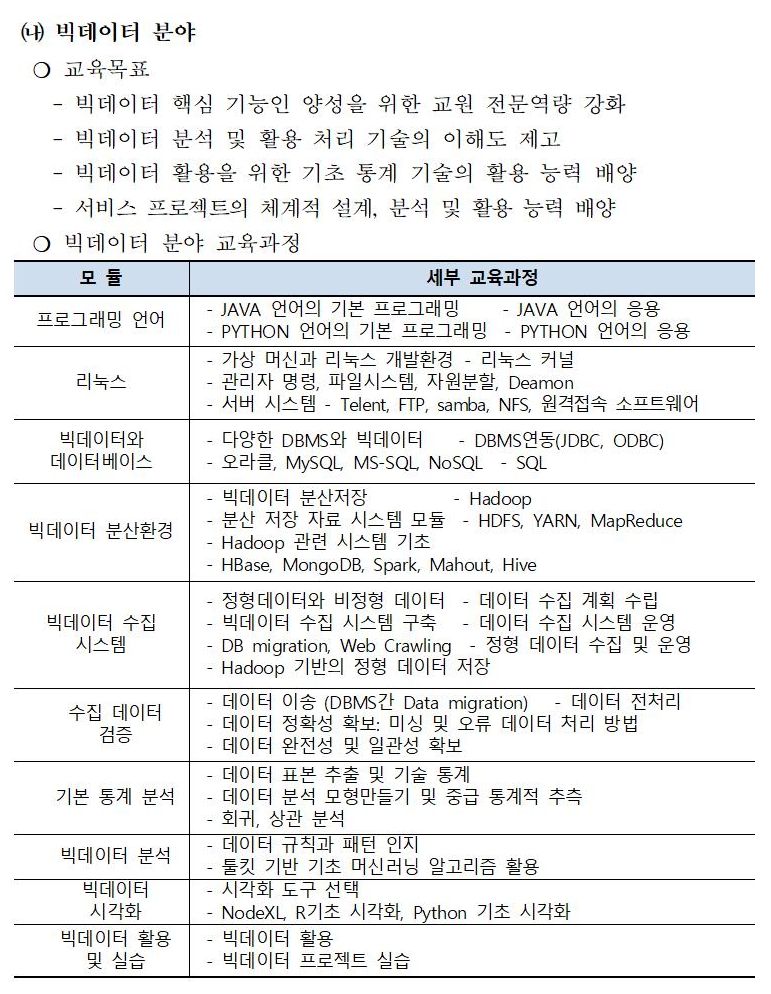 그나마 빅데이터는 서비스 프로젝트의 체계적 설계 및 분석 및 활용 능력 배양이라는 목표가 어느정도 맞아 떨어지긴 하지만 커리큘럼은 대부분 프로그래머 양성에 집중되어 있다고 봐야 할 것이다.