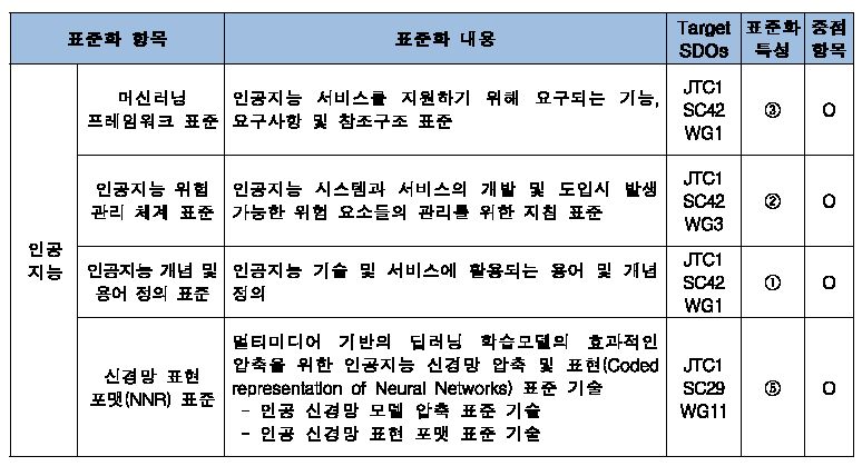 세부적으로 인공지능 / 빅데이터 / 로봇지능으로 분류되어 있으며 세부 표준화 항목 및 표준화 내용 해외 표준화기구(Target SDOs) 그리고 표준화 특성분류(① 개념/정의 표준 ② 유즈케이스, 요구사항 표준 ③ 기능 도출, 참조구조 표준 ④ 데이터 포맷, 스키마 표준 ⑤ 프로토콜, 인터페이스 표준) 및 중점항목 유무등을 잘 분류해 두었습니다.