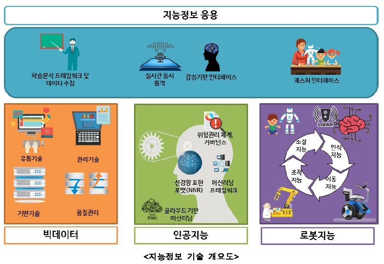 * 우리나라는 인간의 지능을 모방한 인공지능 기술을 기반으로 대량의 데이터 생성, 저장, 분석 및 이를 활용하는 빅데이터와 실시간 반응, 무인 의사결정을 제공하는 로봇분야로 구성하고 이를 통합 연계하는 것을 지능정보로 보고 있습니다.