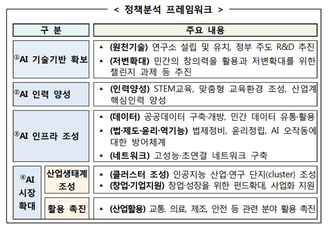 AI 기술기반 확보 / AI 인력양성 / AI 인프라 조성 / AI 시장 확대로 각 국가의 대응에 대해 잘 정리되어 있으며
