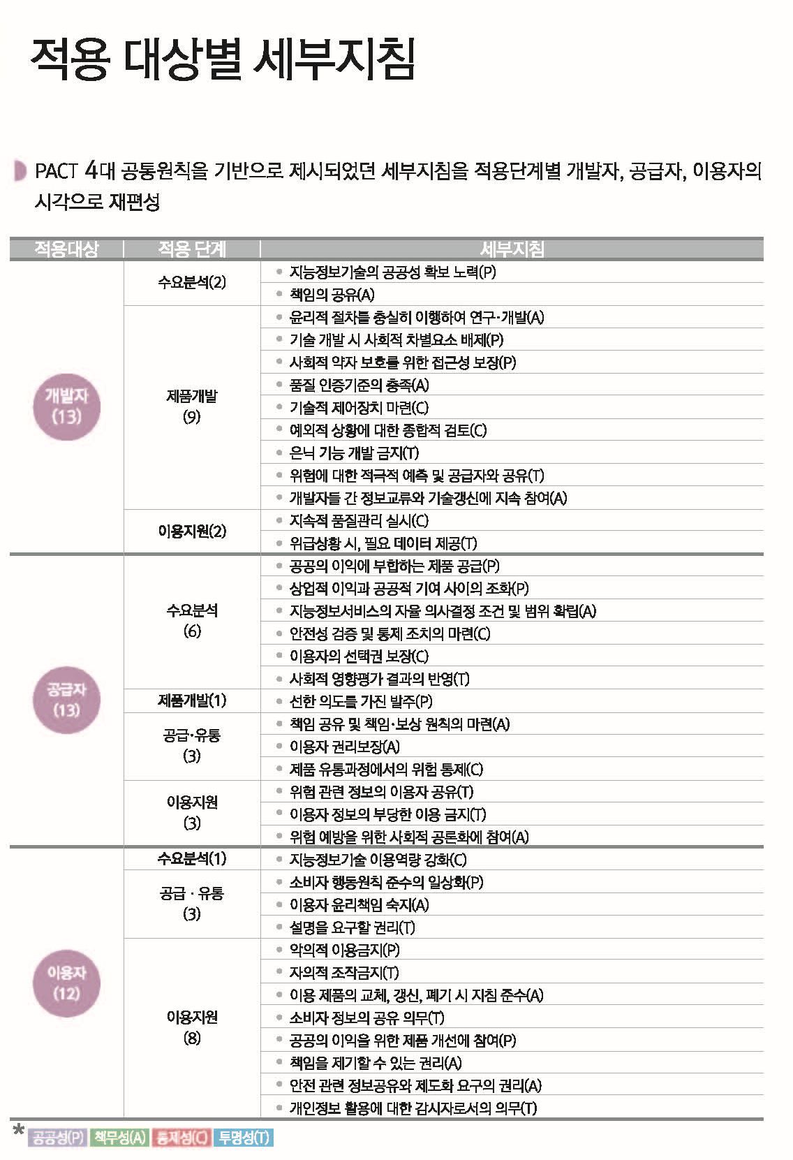 해당 내용을 보면 개발자, 공급자, 이용자에 대하여 세부적으로 지침을 가지며 공공성, 책무성, 통제성, 투명성의 4대 공통원칙을 기반으로 제시하였습니다.