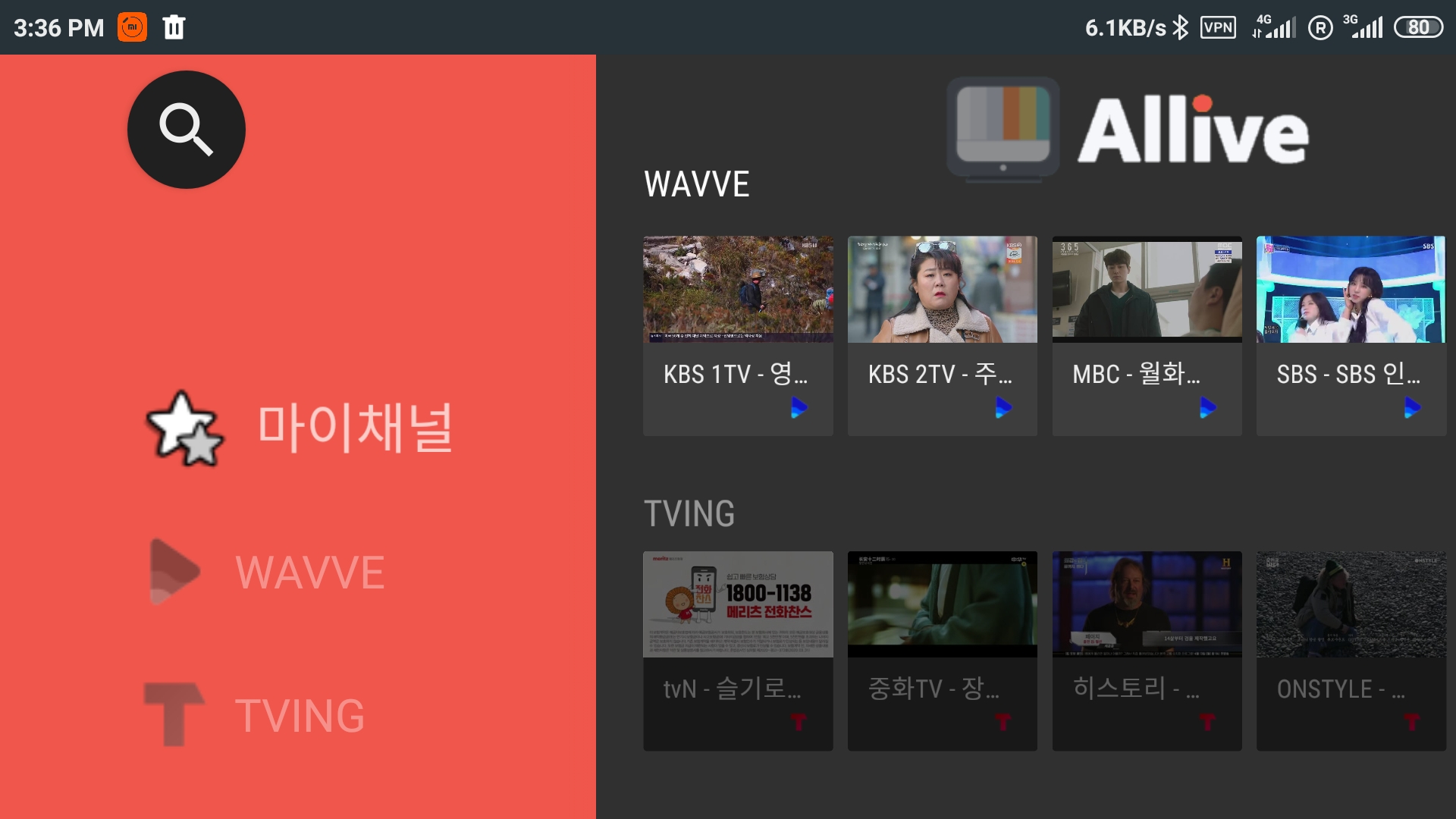 1. ALLIVE TV : https://github.com/PYTHONKOR/alltv