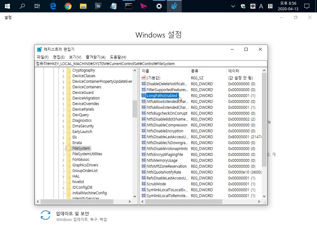 13. 레지스터리 창을 열어 LongPathsEnabled 의 값을 0에서 1로 수정하자!