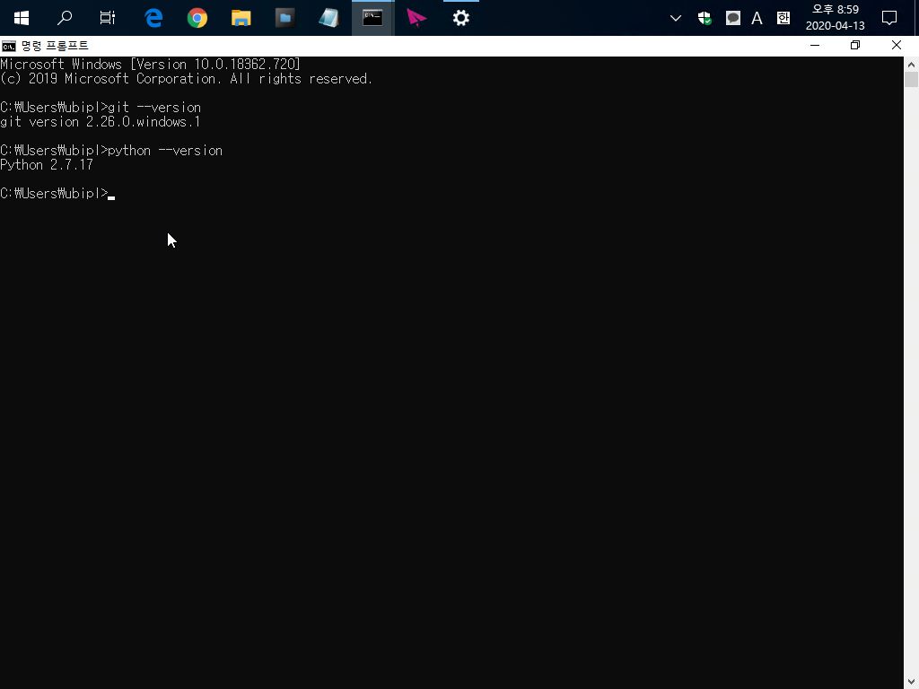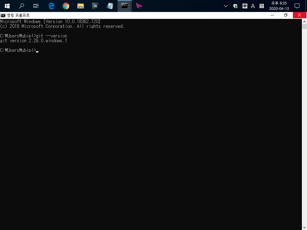 7. 여기서 git --version 이라고 치면 git version 2.26.0.windows.1 이라고 나온다. (2020년 4월 13일 기준 2.26.0이며 아마 이후에는 버전이 올라갔을 것이다.) git version이 안나왔으면 정상 설치가 안된 것이니 설치부터 다시 찾아보자!