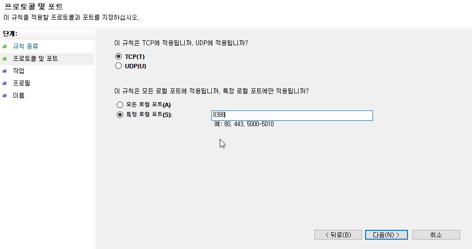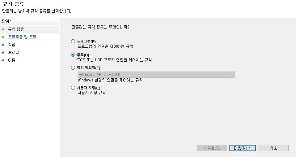 1. 설정(제어판) - Windows 설정에서 Windows Defender 방화벽 선택 - 고급설정 - 인바운드 규칙 - 새 규칙 - 포트를 선택한다.