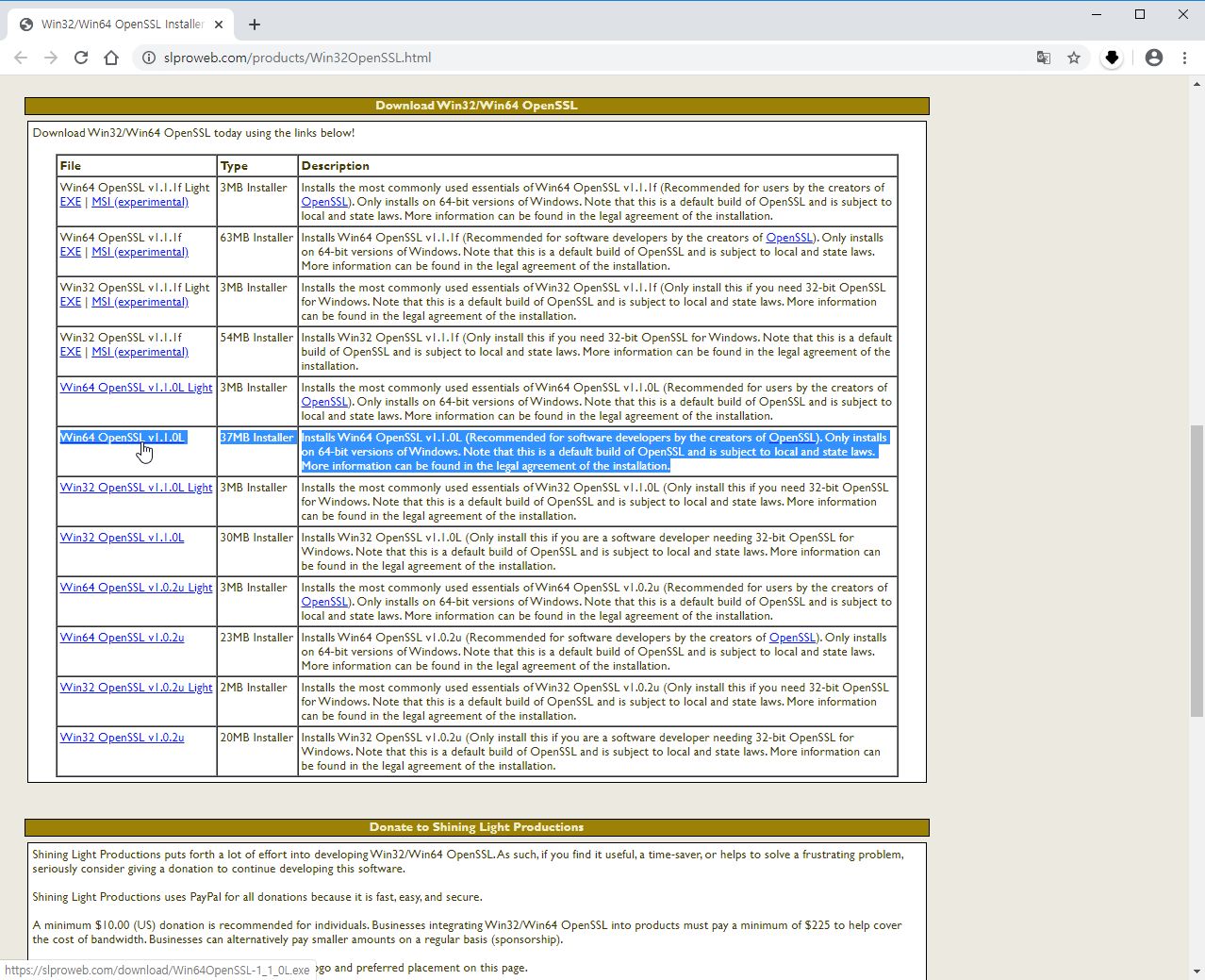64-Bit OpenSSL for Windows 버전을 찾자. 나의 경우는 Win64 OpenSSL v1.1.0L 를 설치하였다.