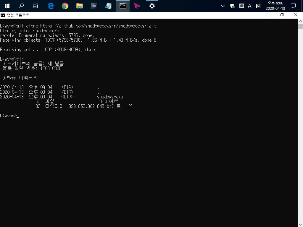 우선 명령프롬프트를 열어보자! 그런 후 ShadowsocksR을 설치할 폴더로 이동한다.