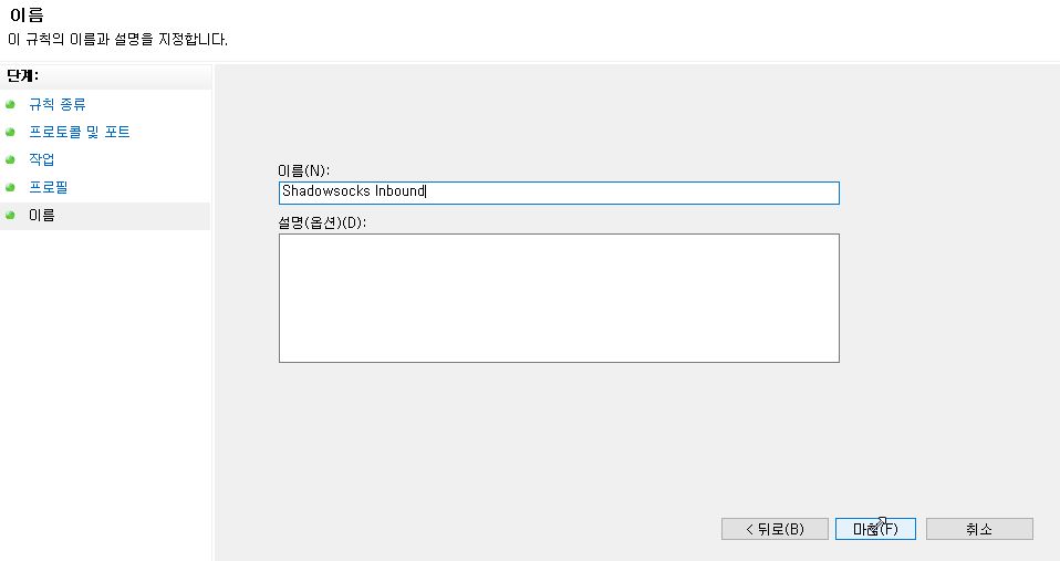 5. 그 다음 방화벽 규칙의 이름을 정하자. 나는 Shadowsocks Inbound 라고 명칭하였다.