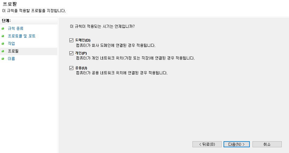 4. 프로필은 네트워크가 연결되는 방식인데 나는 그냥 모두 선택하고 있다.