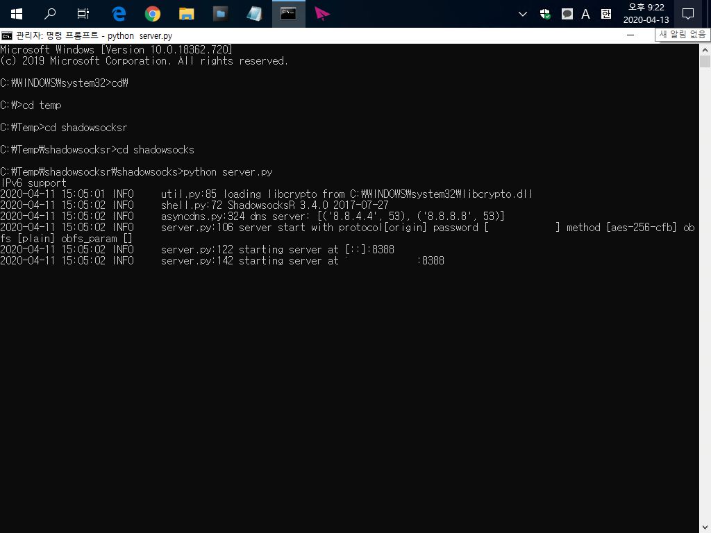 파이선 서버는 Shadowsocks가 설치된 폴더에서 실행해야 한다.