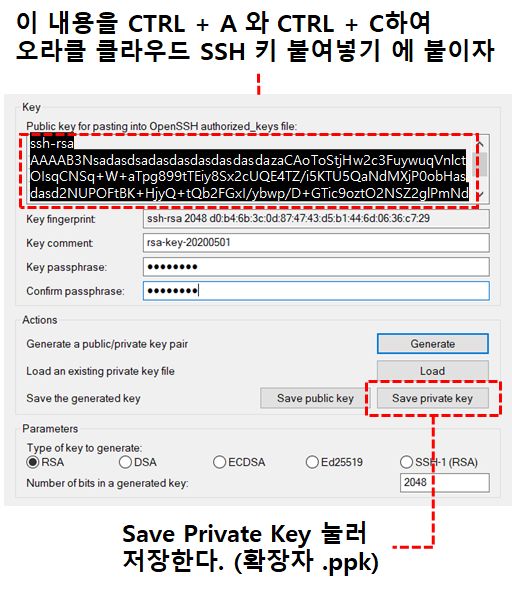 4. SSH 키가 생성되었으면 우선 Save Private Key 버튼을 눌러 저장하고 KEY 내용을 클립보드에 저장합니다. (CTRL + A 후 CTRL + C)
