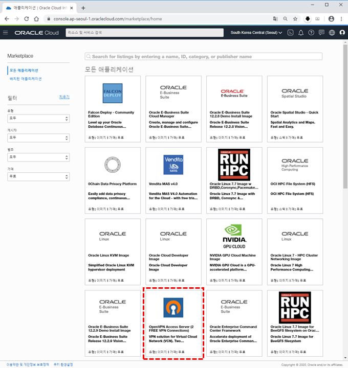 1. 오라클 클라우드 마켓플레이스 > 애플리케이션을 선택합니다.