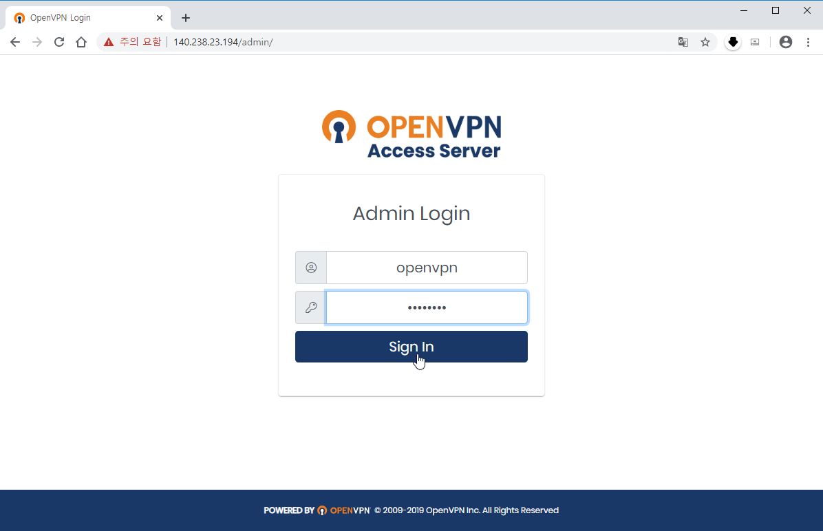 9. 접속 후 login as에서 'openvpnas'라고 입력합니다.