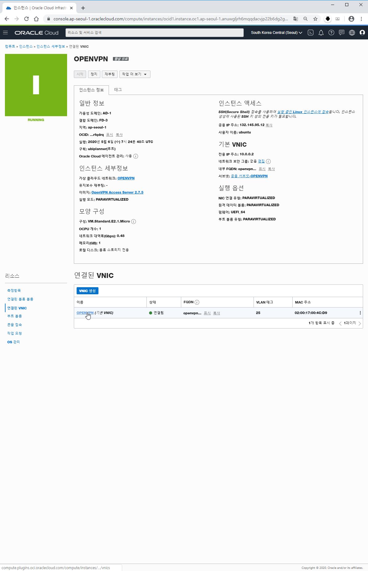 5. 인스턴스 세부 설정의 왼쪽 아래 리소스에서 연결된 VNIC를 선택합니다.