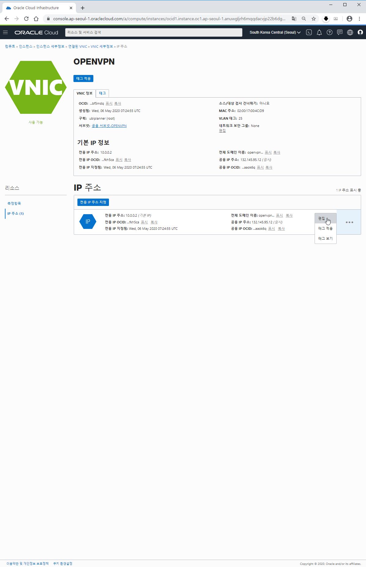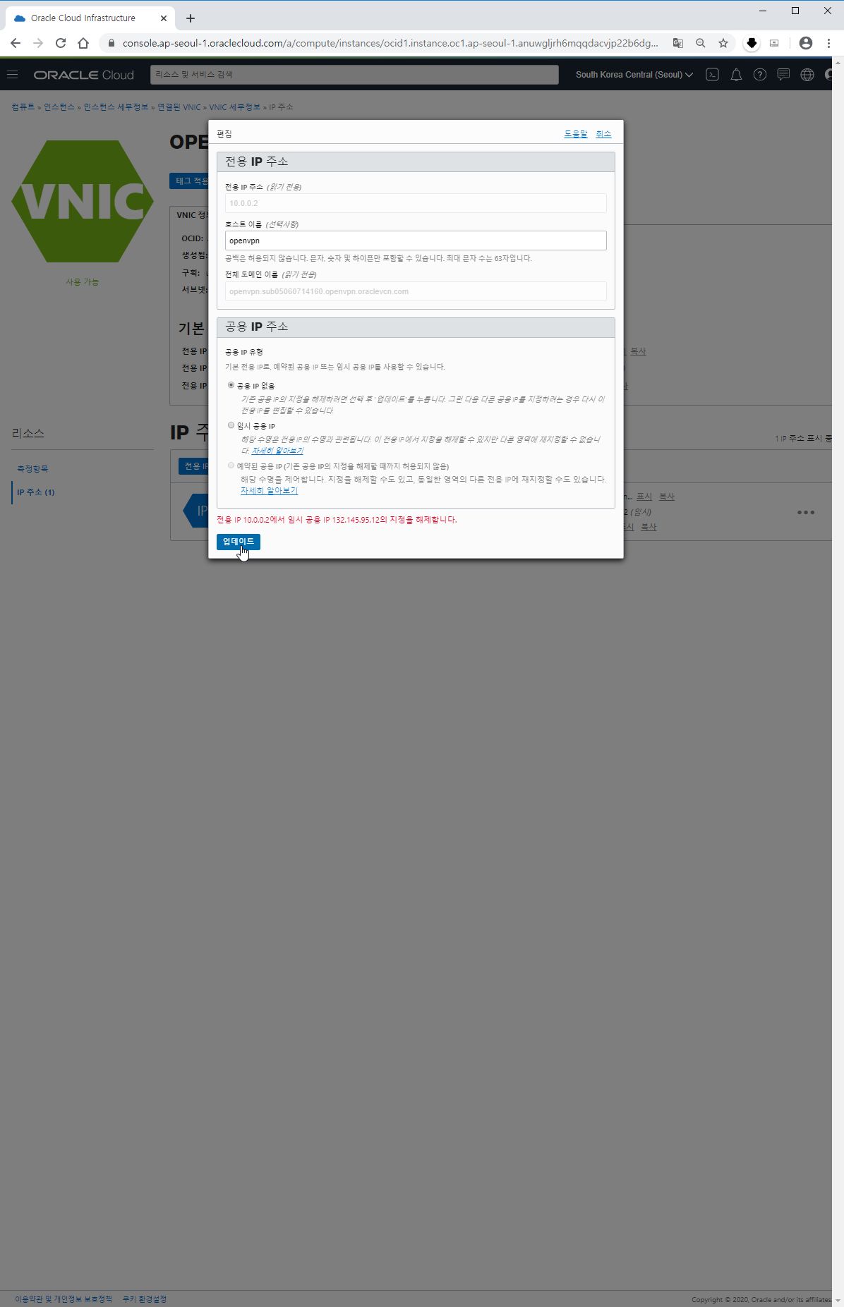 현재 인스턴스 서버의 공용 IP주소가 132.145.95.12로 보이는 것을 확인할 수 있습니다. 해당 IP주소를 변경해 보겠습니다.