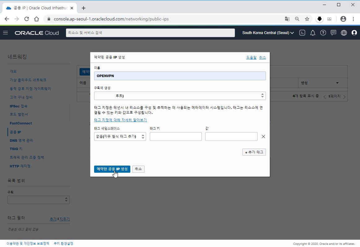 이상이 예약된 (고정) 공용IP생성입니다.