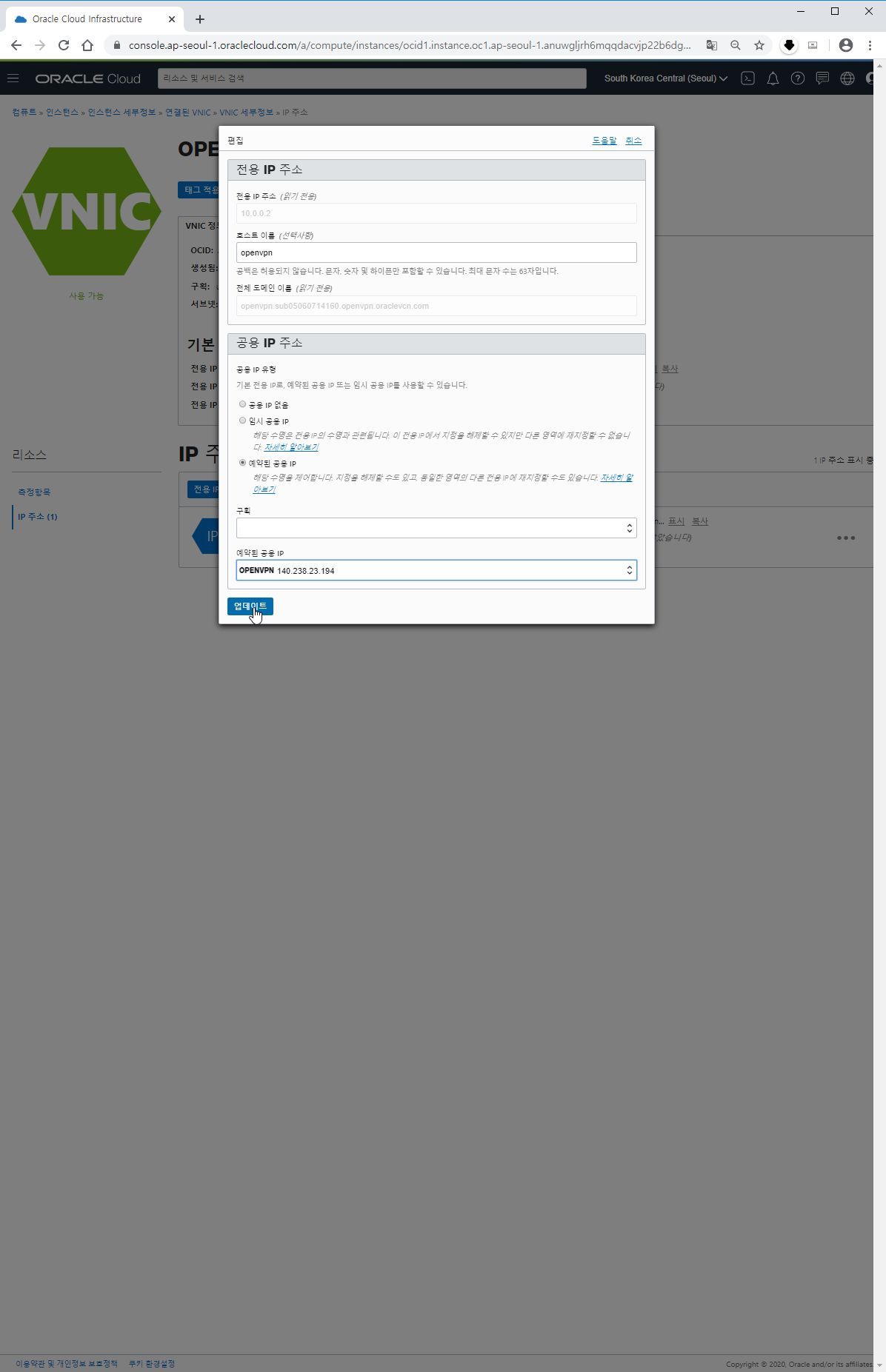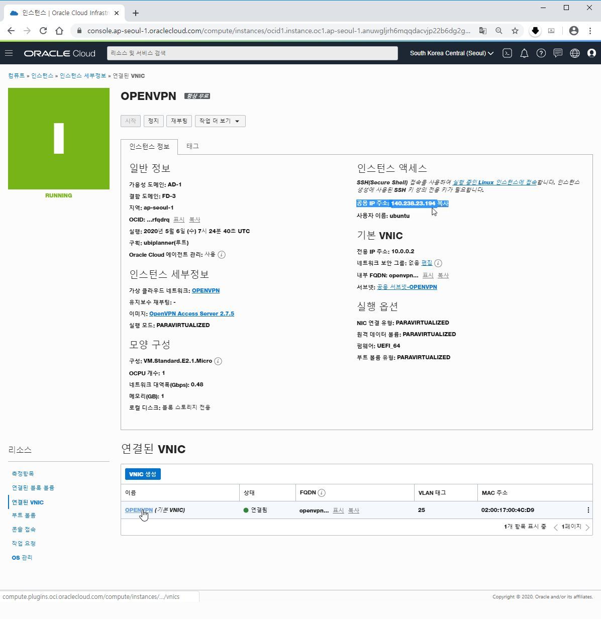 오라클 클라우드는 인스턴스 서버를 설정하면 바로 공용IP를 할당해 줍니다.