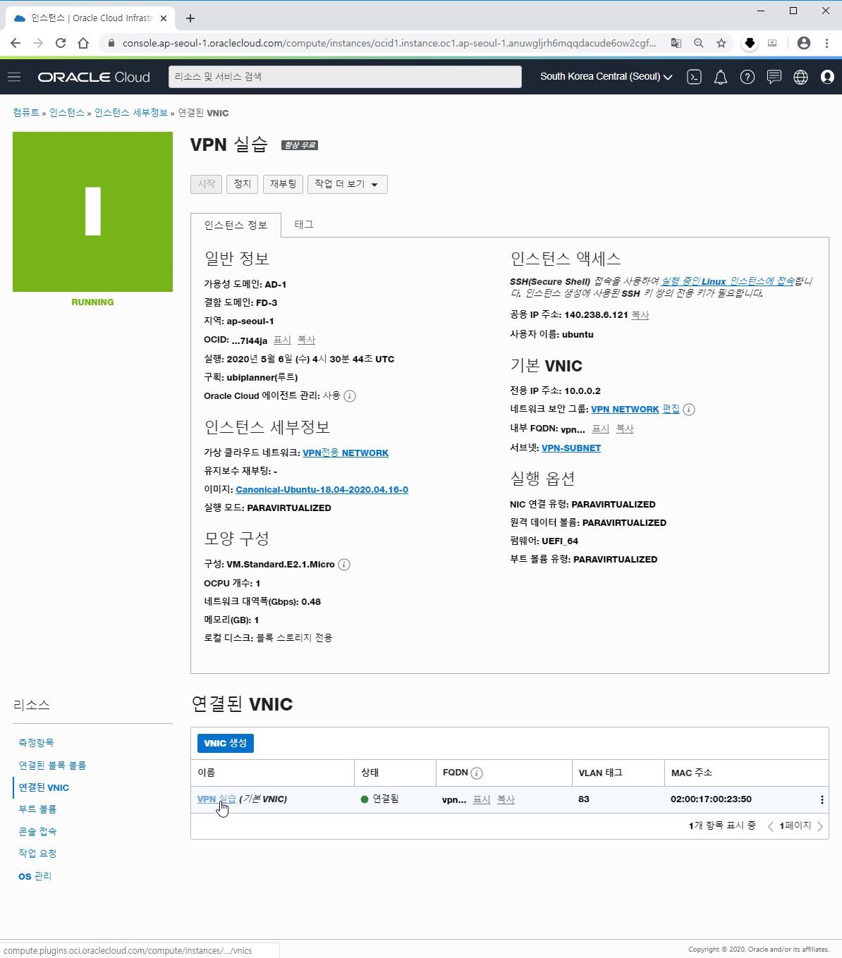 세부정보에서 왼쪽 하단 리소스에 연결된 VNIC를 선택합니다.