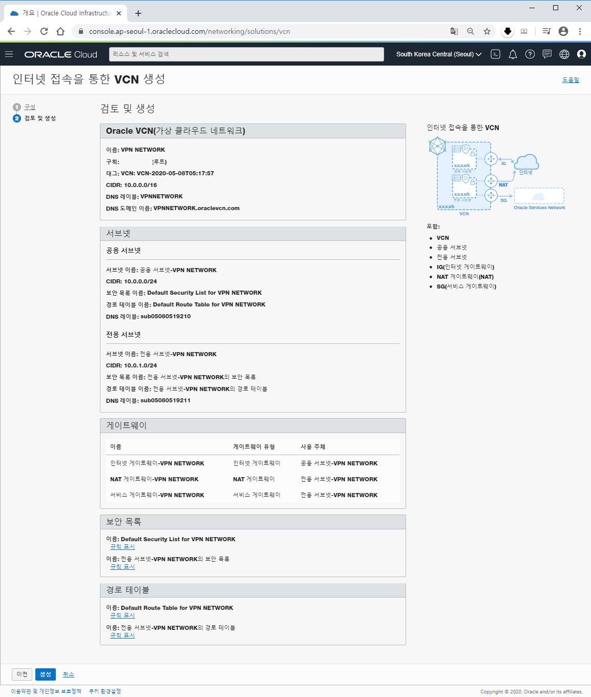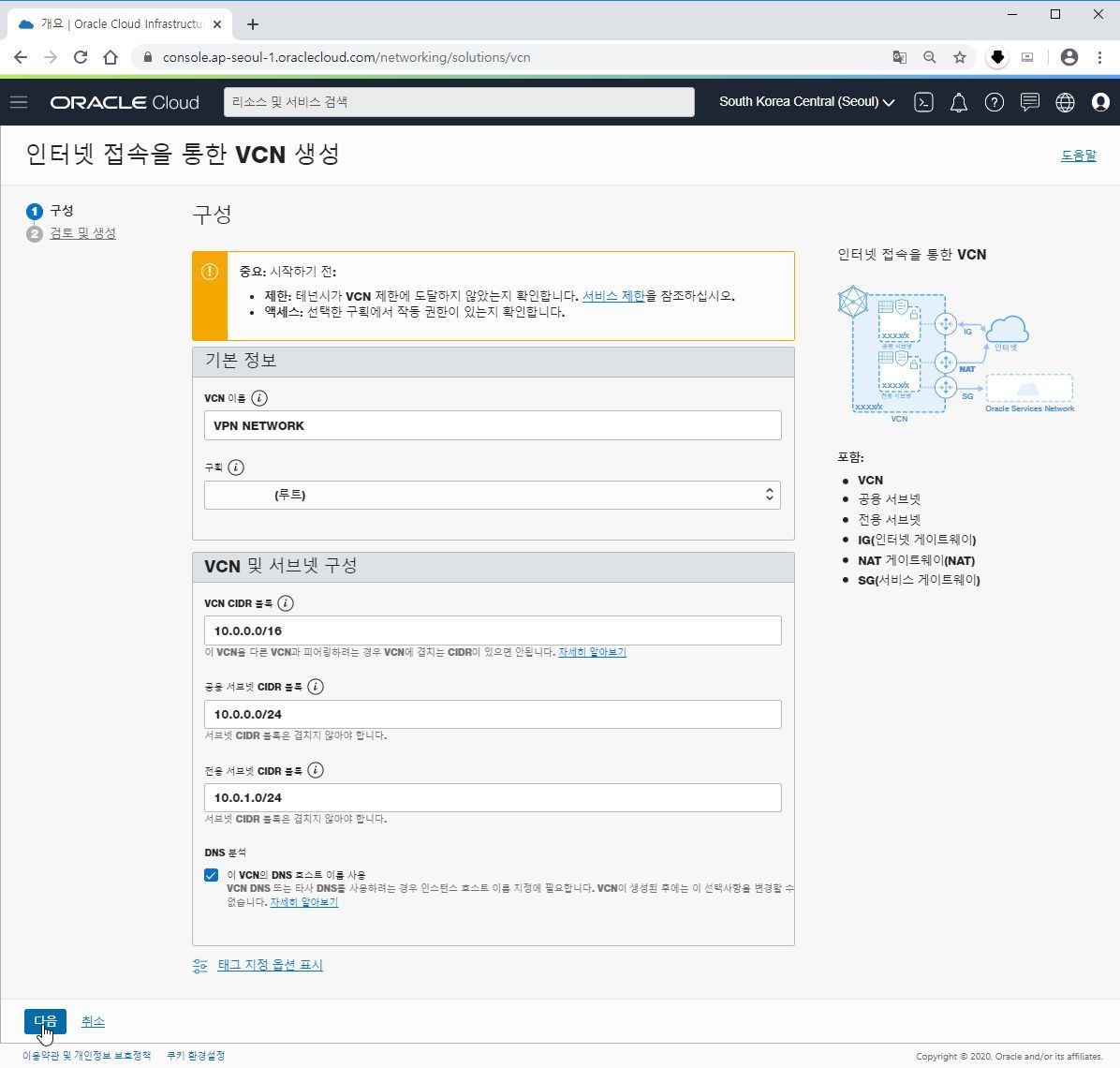 아래 VCN 및 서브넷 구성은 기본으로 제공되는 값을 사용하시면 됩니다.