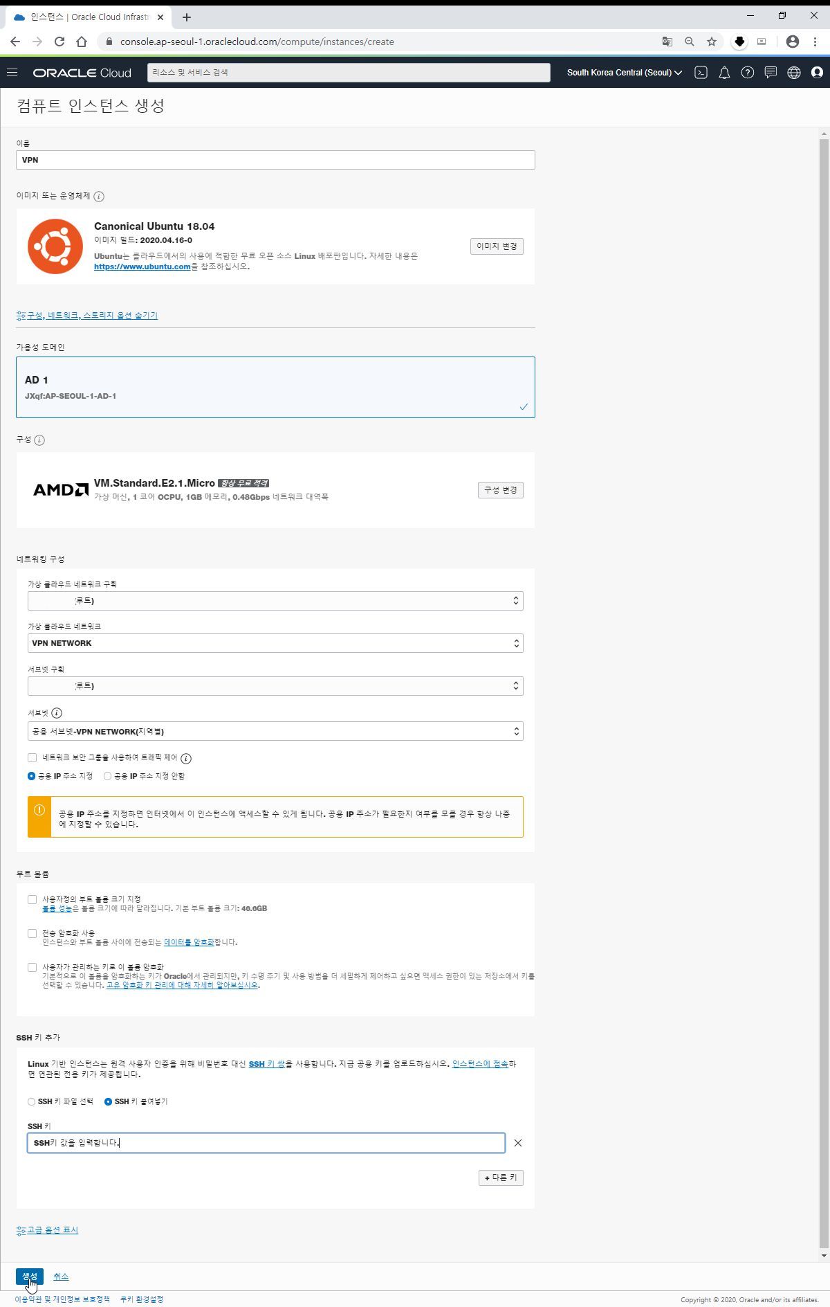 * 항상 무료 적격인 AMD VM.Standard.E2.1.Micro를 선택하면 바로 서버가 생성이 되지 않습니다.