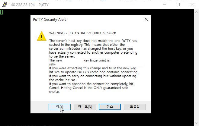 처음 접속하시면 PuTTY Security Alert이 나타나며 이때 예를 누르시면 됩니다.