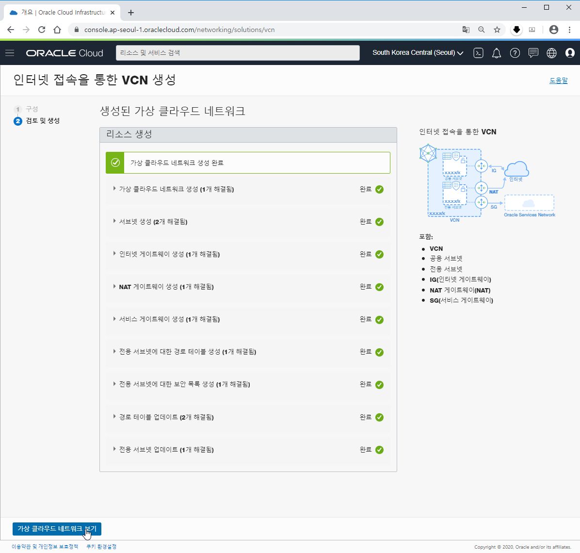 A-5. 가상 클라우드 네트워크를 생성하는 과정을 보여줍니다. 생성이 완료되면 가상 클라우드 네트워크 보기를 누르시면 됩니다.