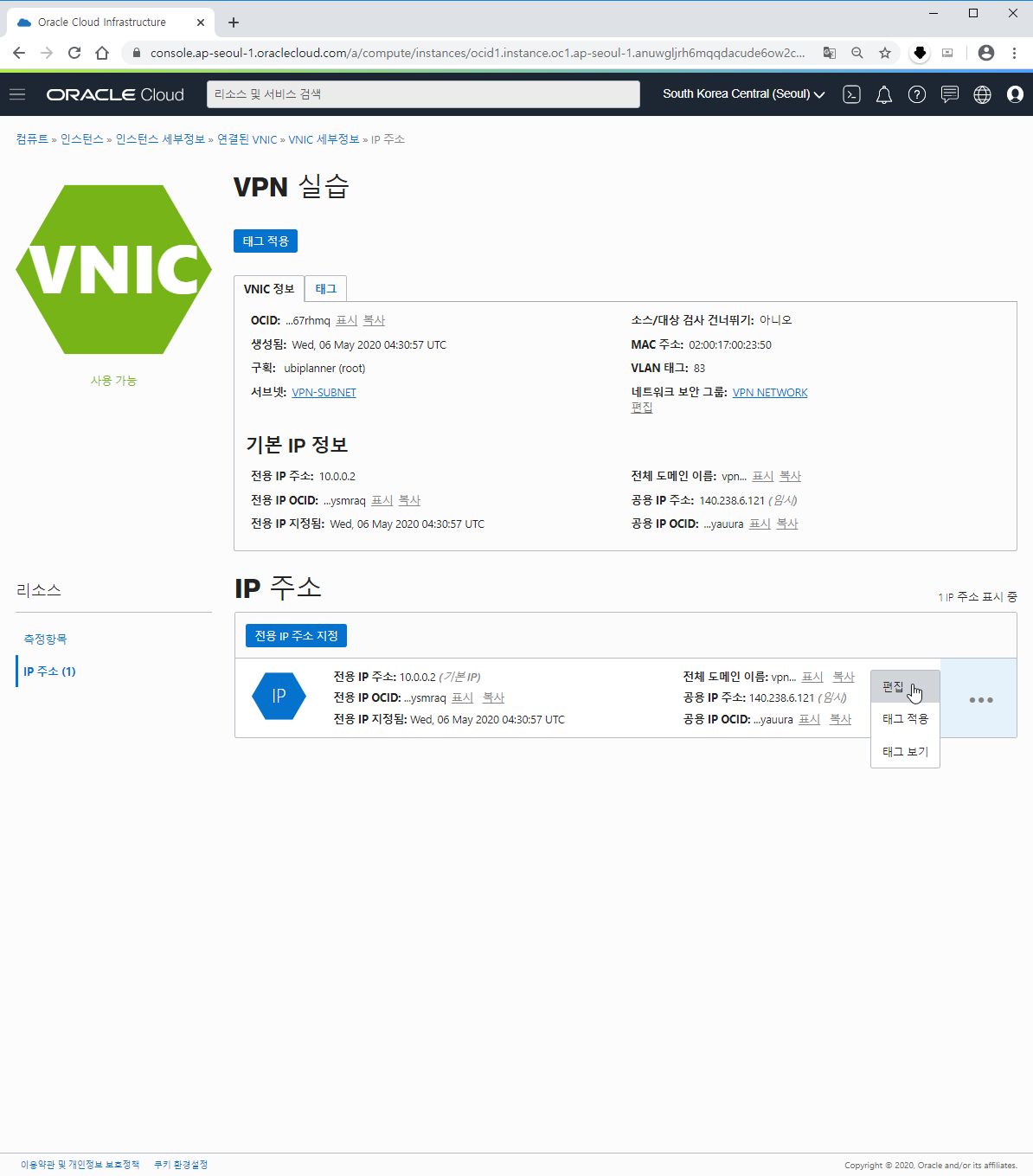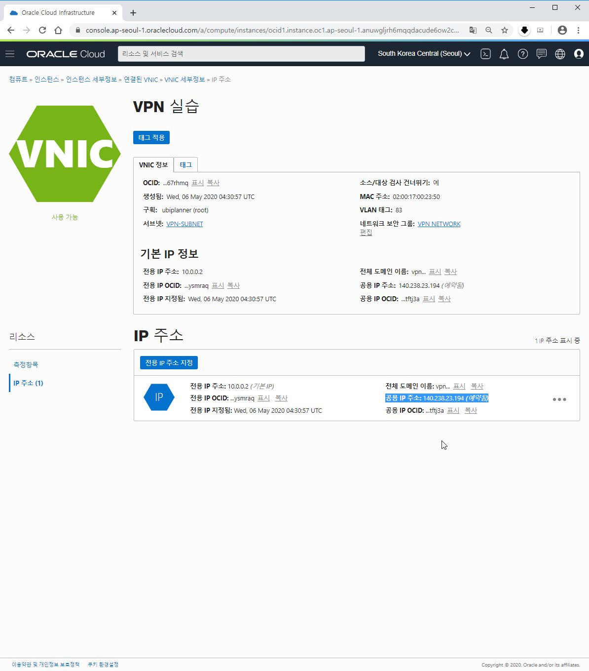 B-5. 리소스의 VNIC 세부정보에 접속하셨으면 동일하게 왼쪽 아래 리소스에서 IP주소를 클릭합니다.