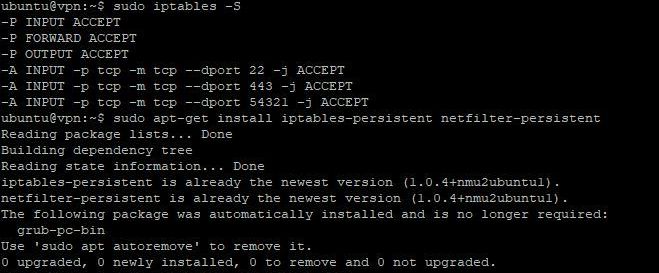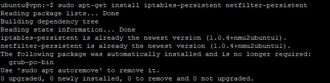 ubuntu@vpn:~$ sudo apt-get install iptables-persistent netfilter-persistent
