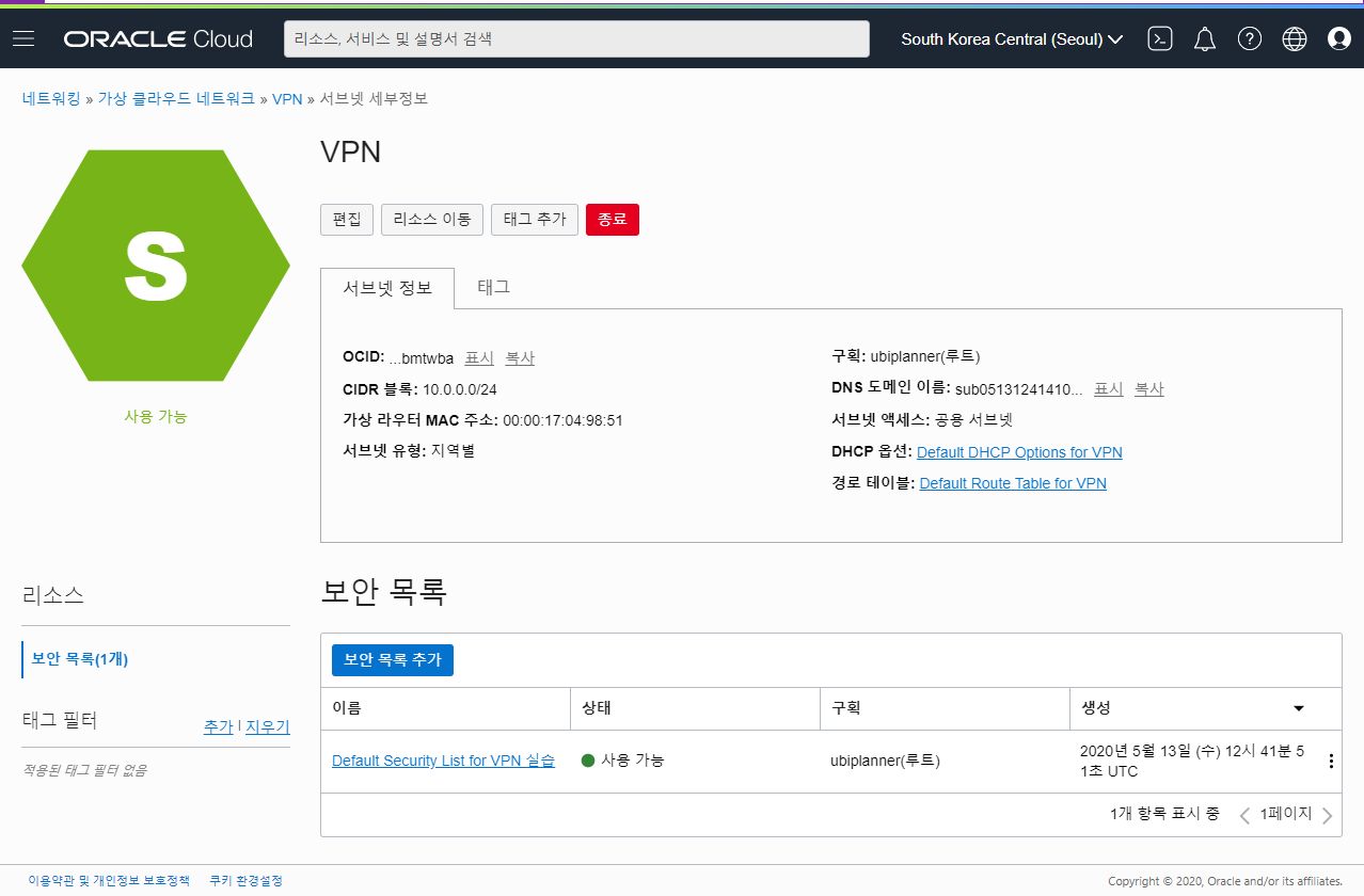 그 다음 생성한 오라클 클라우드 인스턴스 서버의 가상 클라우드 네트워크(VCN)에 가서 서브넷에 포트를 넣어 보겠습니다.