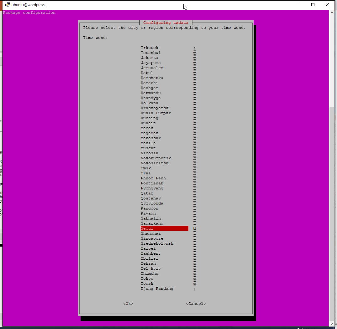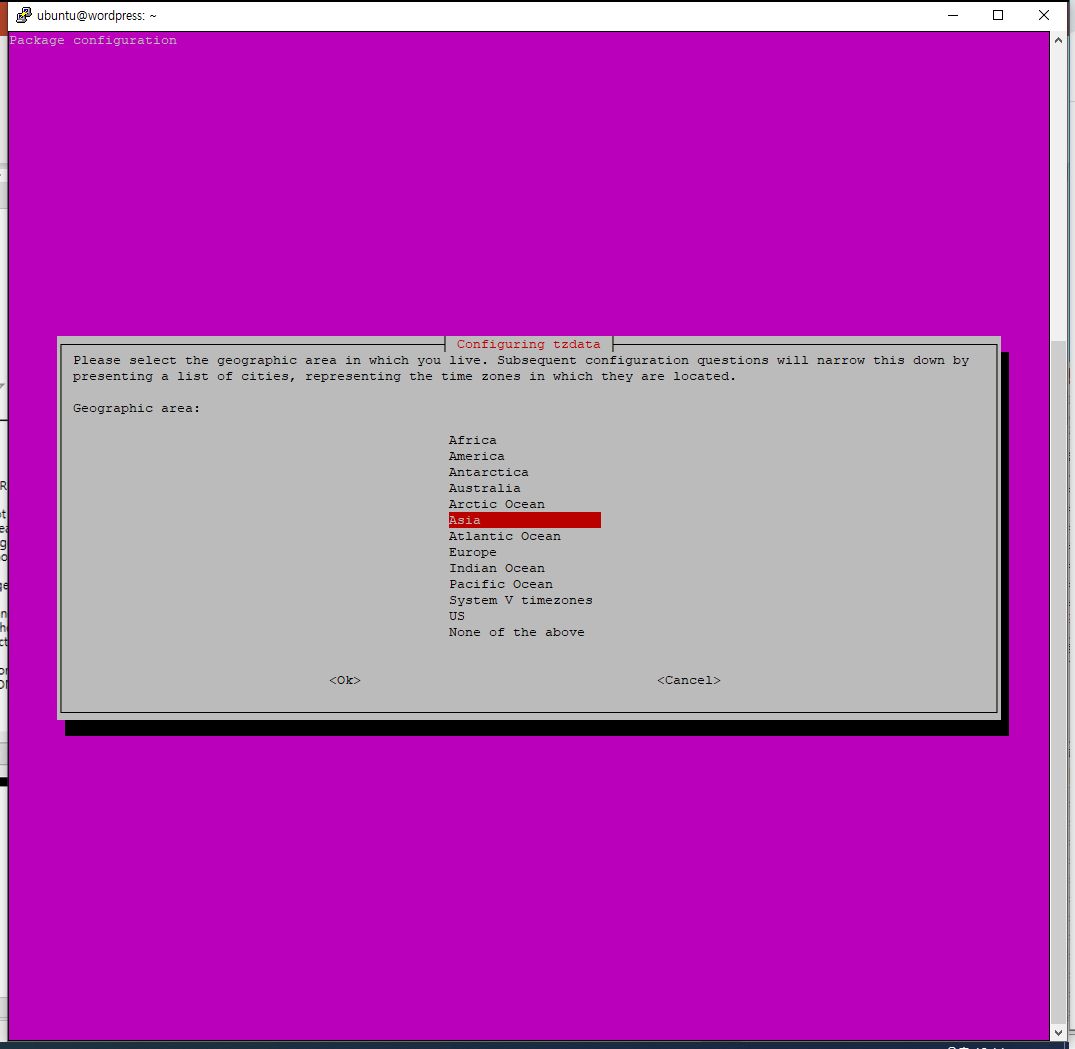 sudo dpkg-reconfigure tzdata를 입력하여 실행합니다.