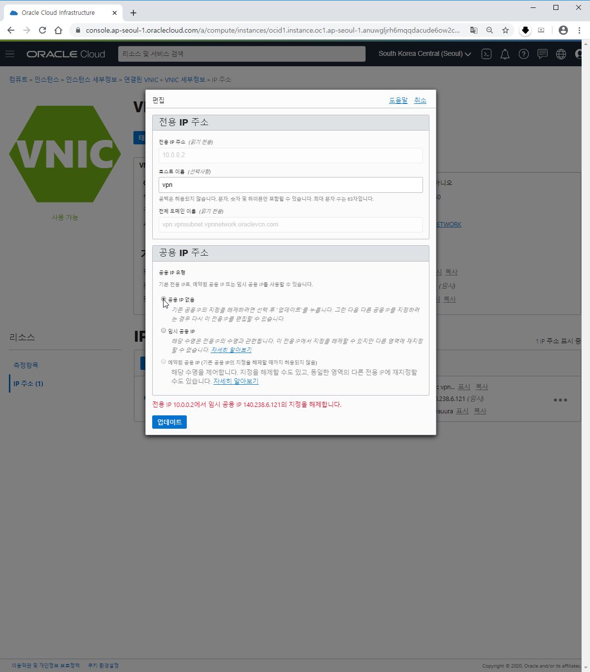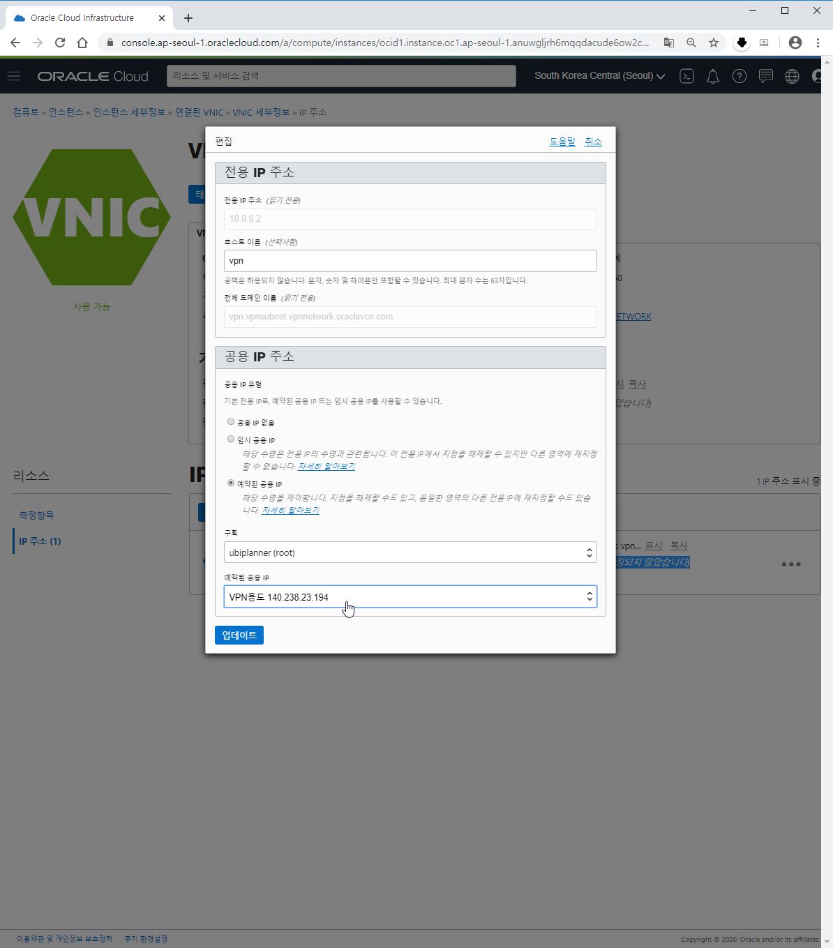 B-8. 그 다음 업데이트 하시면 공용IP주소가 예약된 IP주소로 변경된 것을 확인하실 수 있습니다.