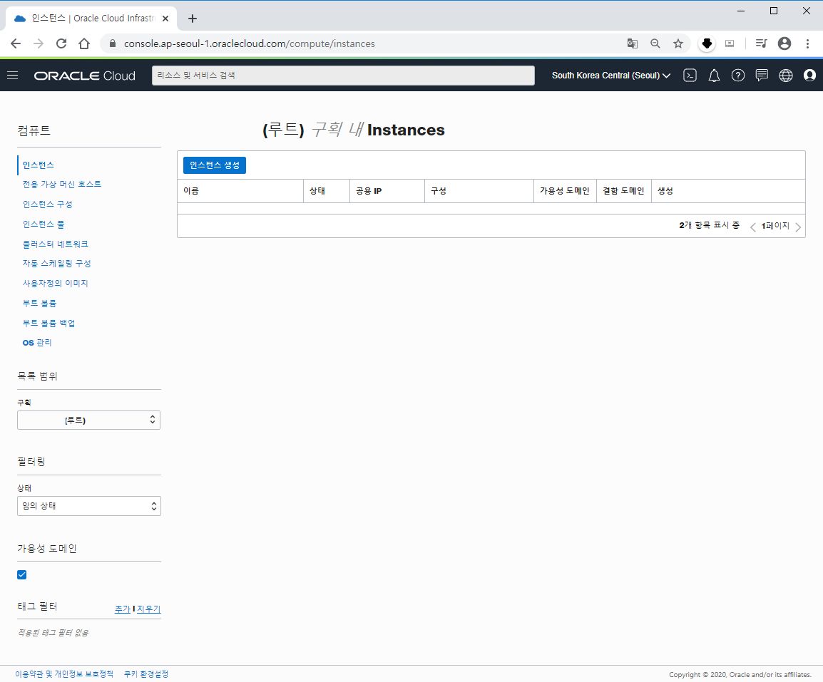 메뉴 > 컴퓨트 > 인스턴스를 선택합니다.