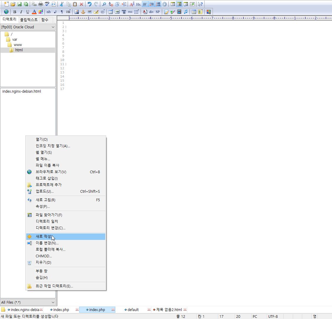 파일들이 있는 곳(index.nginx-debian.html)에서 마우스 오른쪽을 눌러 새로 작성을 누릅니다.