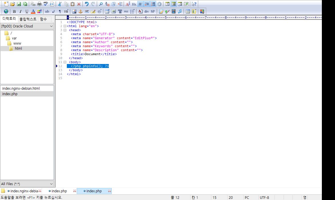 EditPlus에서 /var/www/html/에서 index.php를 만들어 봅니다.