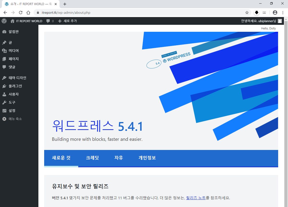 업데이트가 완성되면 워드프레스 해당 버전의 설명이 나타납니다.