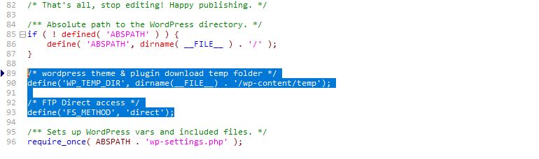 define('FS_METHOD', 'direct'); 라고 입력하면 됩니다. 주석은 /* FTP Direct access */ 라고 하면 될까요?