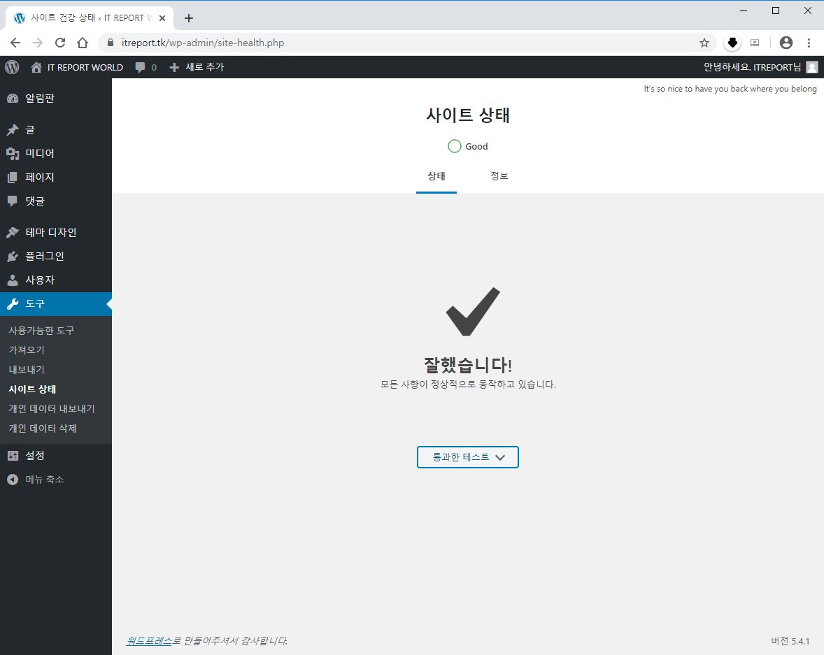 이제 워드프레스 관리자 페이지에 접속하여 도구 > 사이트 건강상태를 체크하면 해당 부분이 해결되었습니다.