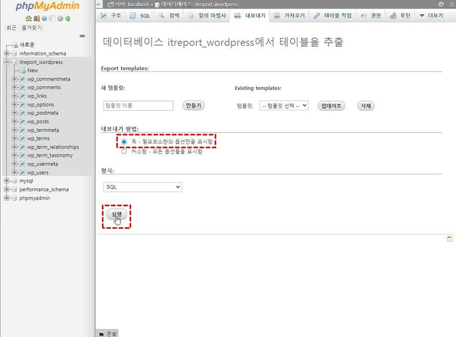 우선 phpMyAdmin에 접속하신 하신 후 왼쪽 DB 트리 중 워드프레스 DB를 선택합니다. (여기서는 itreport_wordpress)