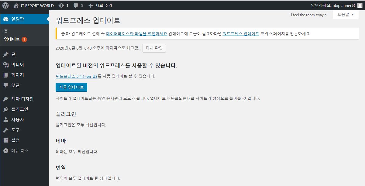 워드프레스 업데이트는 관리자페이지 > 알림판 하단 업데이트를 누릅니다.