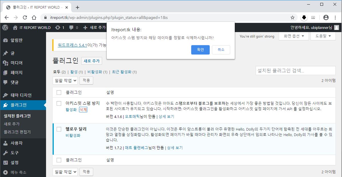 삭제 버튼을 누르면 해당 플러그인이 삭제됩니다.
