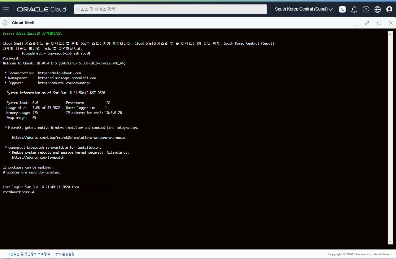 wordpress@cloudshell:~ (ap-seoul-1)$ ssh root@serverip