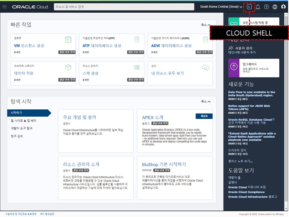 우선 오라클 클라우드에 접속하여 Cloud Shell을 선택합니다.