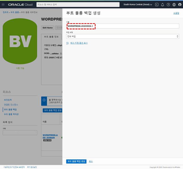 4.이 곳에서 부트 볼륨 백업을 생성합니다. (관리하기 편한 이름을 선택합니다.)