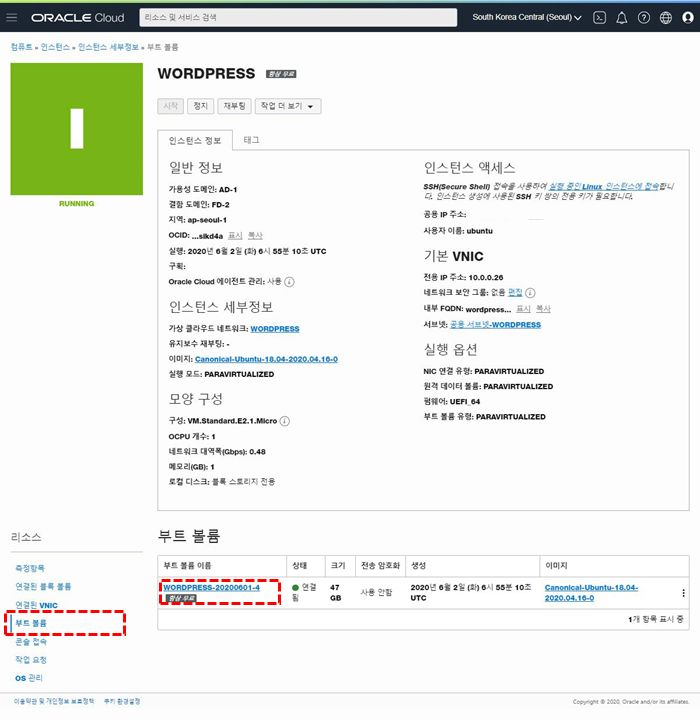 1. 부트 볼륨을 백업하고자 하는 인스턴스 서버의 세부정보를 오픈합니다. 그 후 오른쪽 아래있는 리소스란의 부트볼륨을 클릭합니다. 그리고 현재 부트볼륨이 보이면 부트볼륨을 클릭합니다.